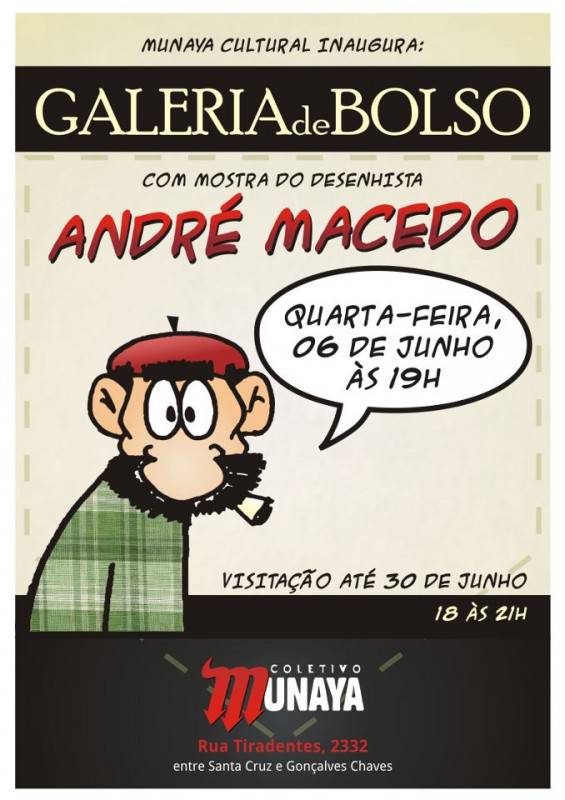 O Coletivo Munaya inaugura nesta quarta-feira (6) às 19h mais um espaço para a arte dentro da sua sede. Galeria de Bolso é o nome da sala de exposições, que conta com estúdio, lanchonete, ateliê de moda e sala multimídia. Para inaugurar a galeria, foi convidado o cartunista André Macedo, que expõe uma seleção de tiras, charges e desenhos, incluindo fragmentos da recente graphic novel Carne viva.