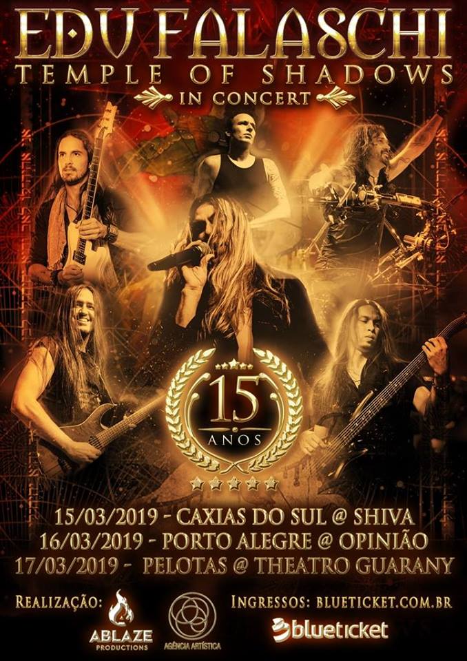 Com as participações de Aquiles Priester e Fábio Laguna, também ex-integrantes do Angra, a turnê batizada de Temple Of Shadows In Concert irá rodar todo Brasil. Após os shows em Caxias do Sul, nesta sexta-feira (15), e na capital gaúcha, no sábado (16), Pelotas será a terceira parada. A apresentação em São Paulo, marcada para o dia 4 de maio, será registrada para um blu-ray e contará com a Orquestra Filarmônica Bachiana e regência do maestro João Carlos Martins.