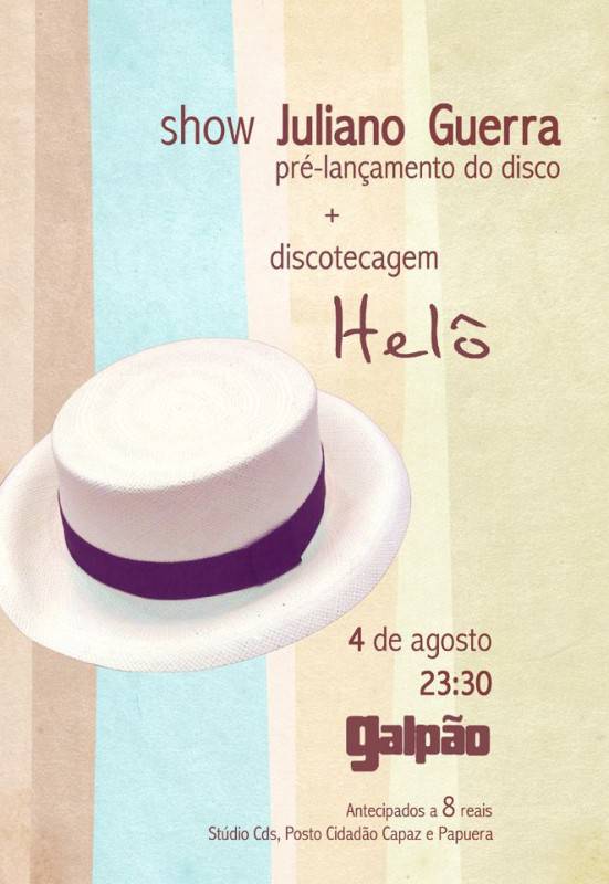 Neste sábado, 04 de agosto, acontece o show de pré-lançamento do disco de Juliano Guerra no Galpão (José do Patrocinio, 08), antes e depois do show o comando da festa fica por conta da Dj Helô, antecipados custam R$8,00 na Studio CDs, Posto Cidadão Capaz e no Papuera Bar.