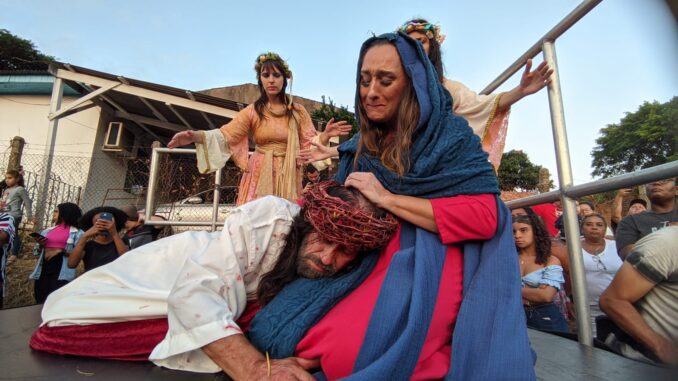 O público seguirá em procissão por mais de um quilômetro e meio até o alto do morro. Durante a caminhada, ao ritmo de tambores, serão representadas as quedas de Jesus e seus encontros com Maria, sua mãe, e Verônica, que enxuga o seu rosto.