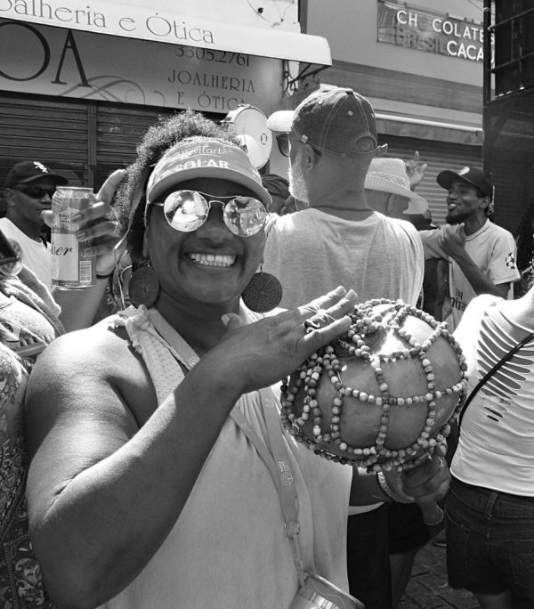 Largo sorriso da ritmista tocando agê (23/02 – 15:13 horas)