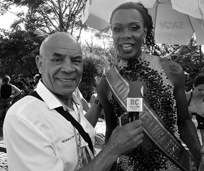 Comunicador homenageado pelo cordão do Ponto Chic, segurando estandarte do Bloco Burlesco Bafo da Onça (2/02 – 17:27 horas)