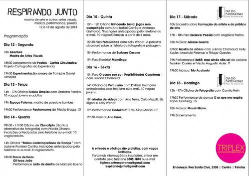 Uma semana para respirar arte em Pelotas. A Mostra de Arte Respirando Junto tem como proposta realizar diversas ações relacionadas às artes que vão desde exposições de trabalhos visuais e poesia, passando por mostra de música, performance, vídeos, intervenções urbanas, até oficinas e workshops. Entendendo que no contemporâneo as artes dialogam todo o tempo e buscando estas interlocuções, o evento propõe diálogos e busca disponibilizar espaço para aqueles que se interessam em respirar junto a arte em Pelotas.